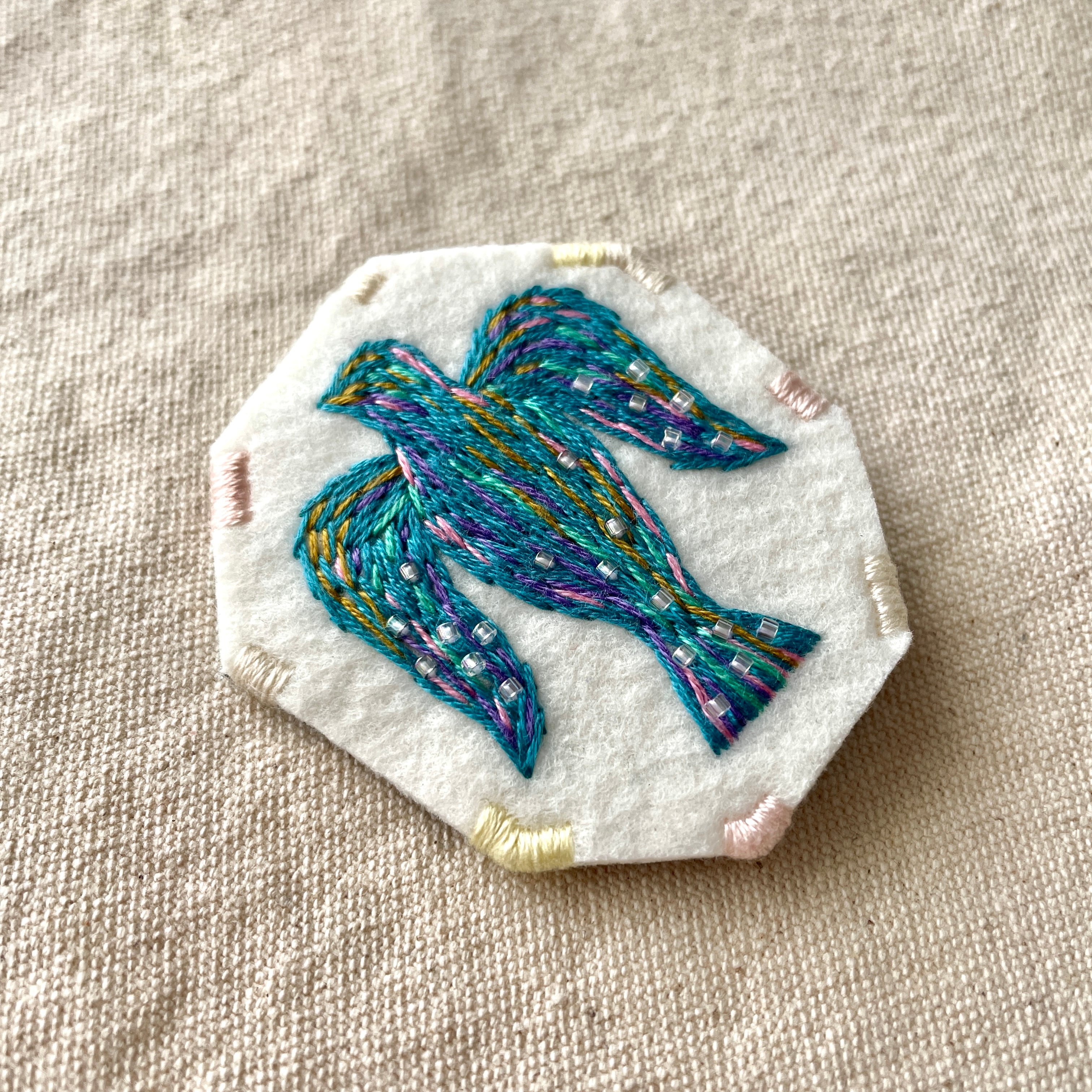 シンボリックな鳥の姿を、数色の糸を混ぜて鳥の羽の美しさをイメージして縫いました。