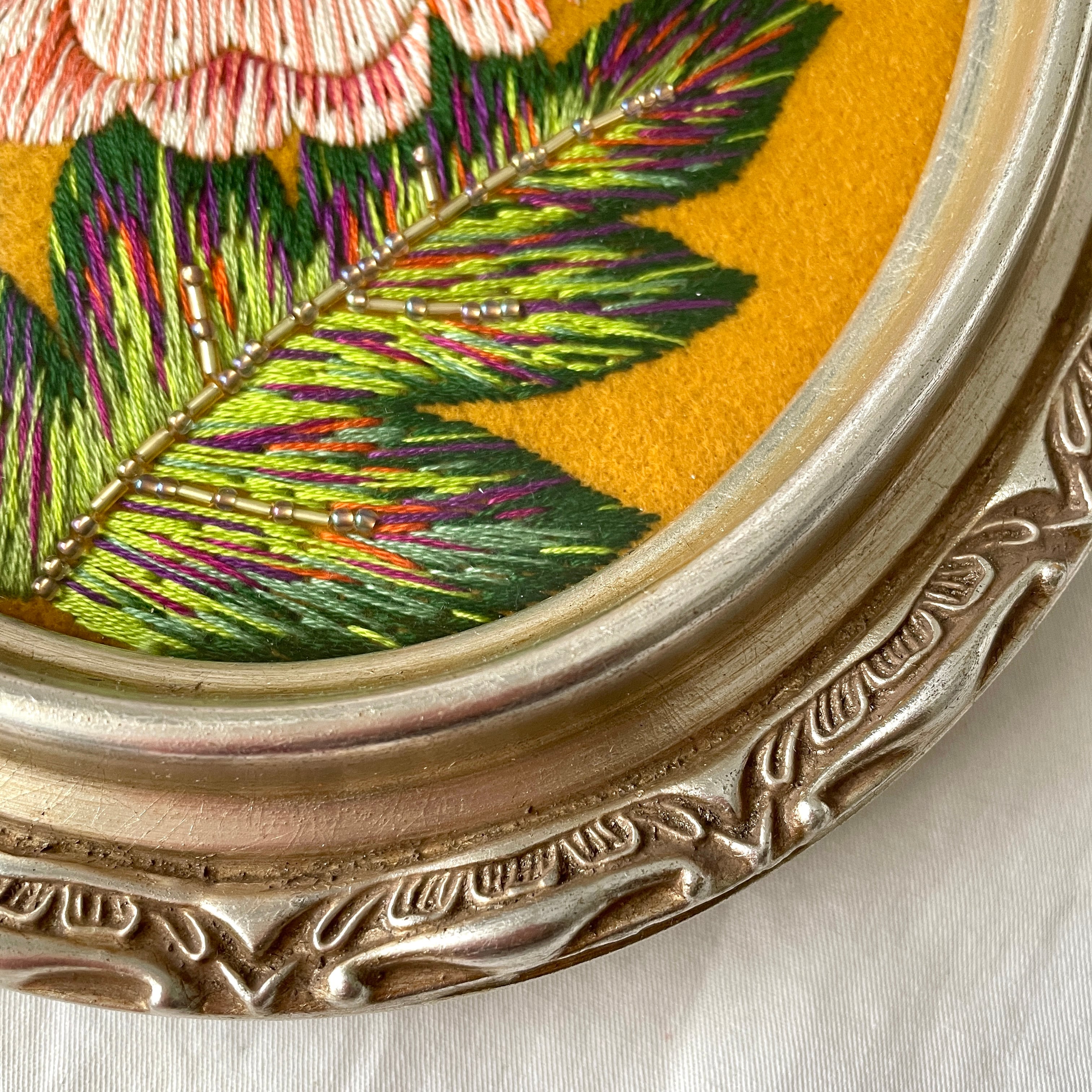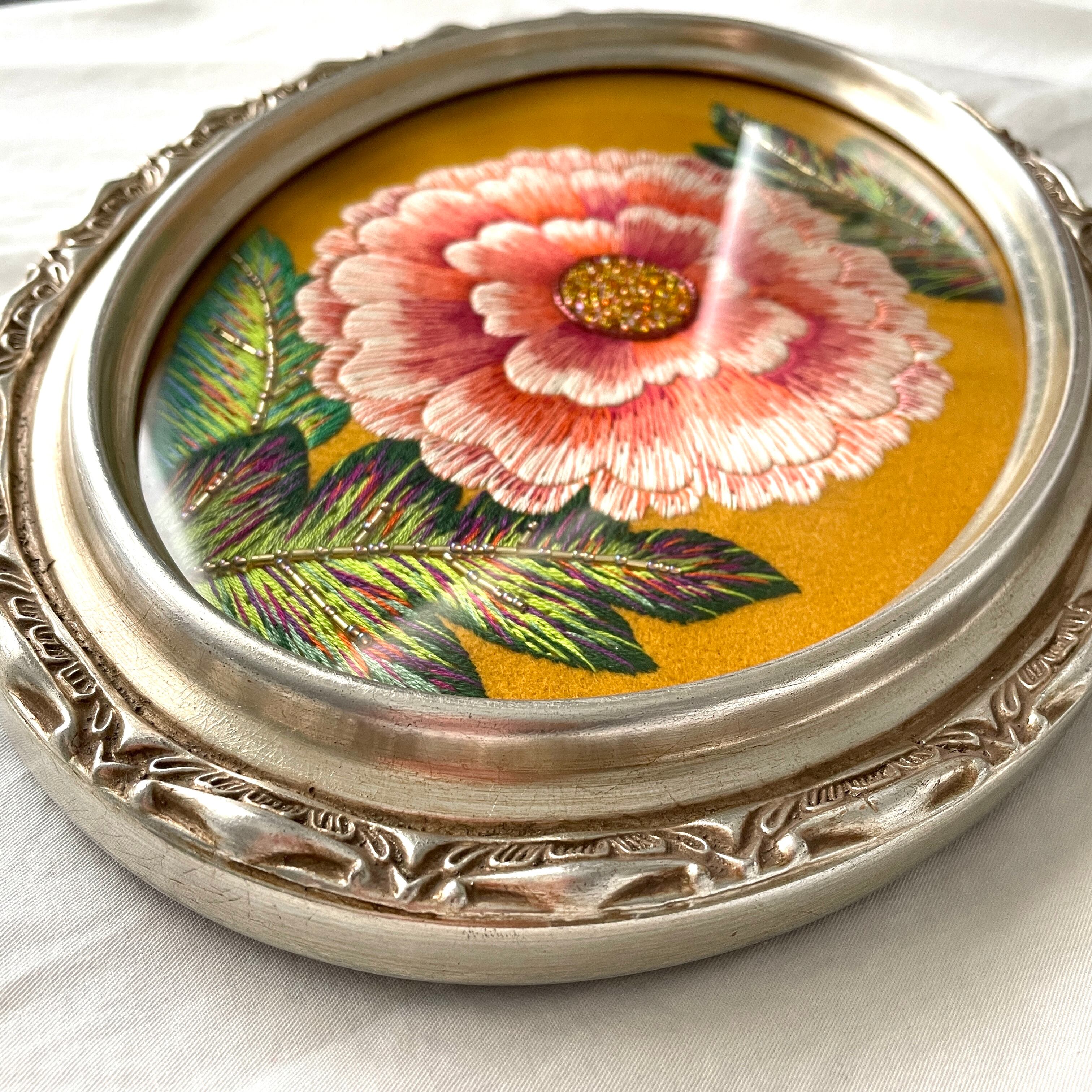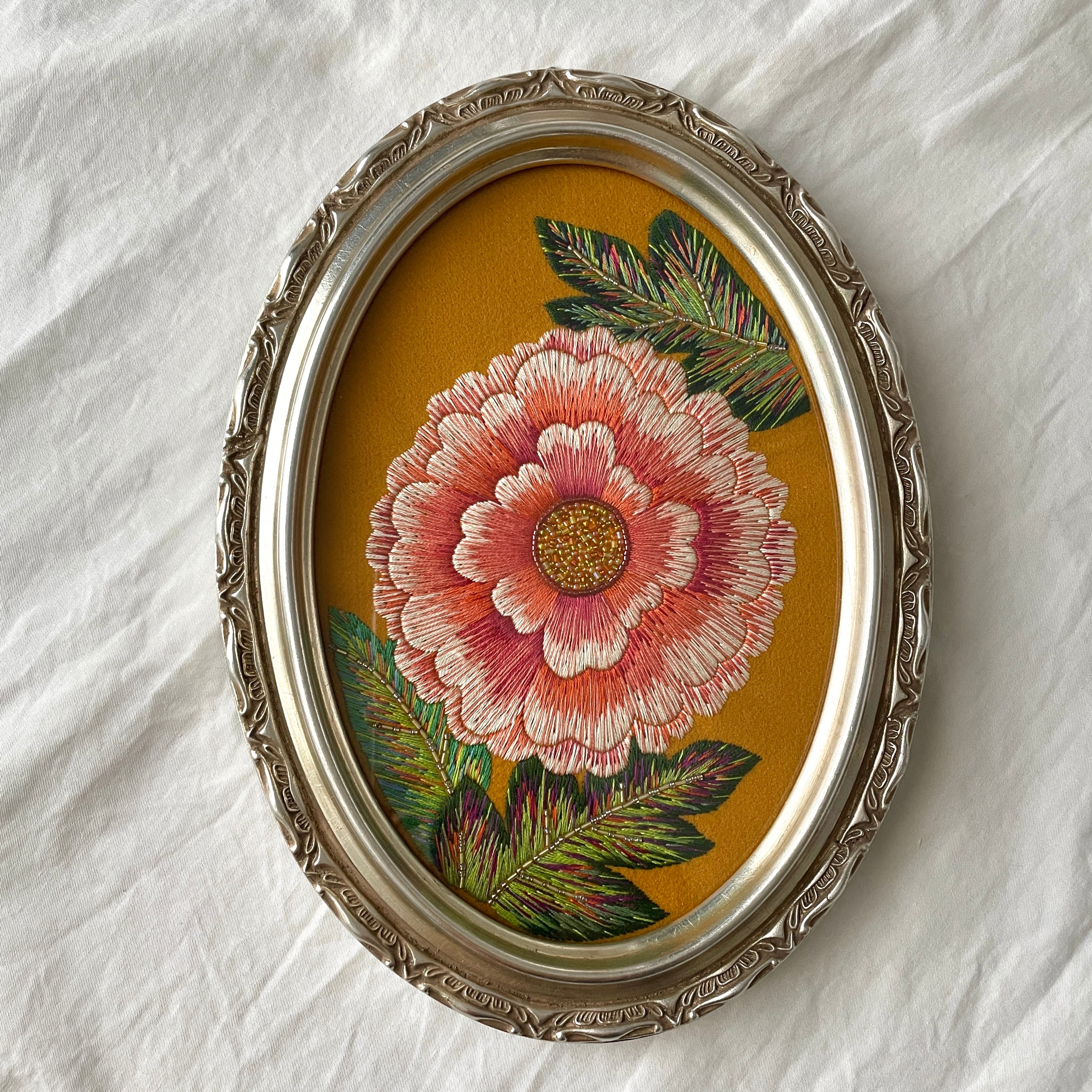 輝くように咲くピンク色の美しい花の刺繍アートフレームです。
